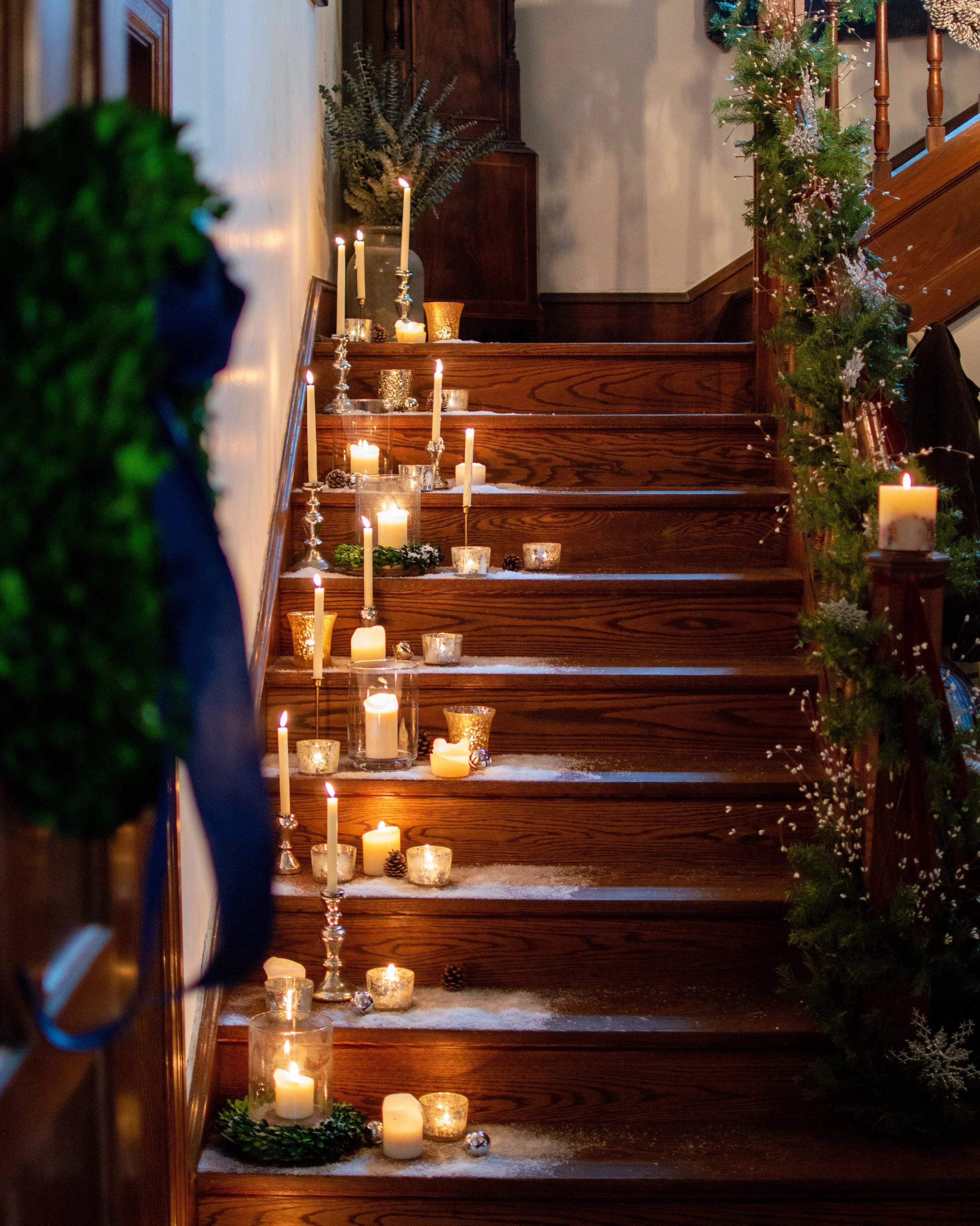 Hanging this faux-cedar garland wrapped in lights in swoops all the way up the stair bannister. I’ve bought this over many years, buying a few 80” segments each year, and now this year will finally have the full bannister done! I’ve used velvet ribbon to attach it to the bannister in a different colour each year, and also tie up our snowy pine cone wreaths on the other side. I’ve also attached little bells all the way along the garland in random places so that when you accidentally brush up against it, it jingles and adds a magical sound of Christmas to the whole experience. The kids LOVE that part!