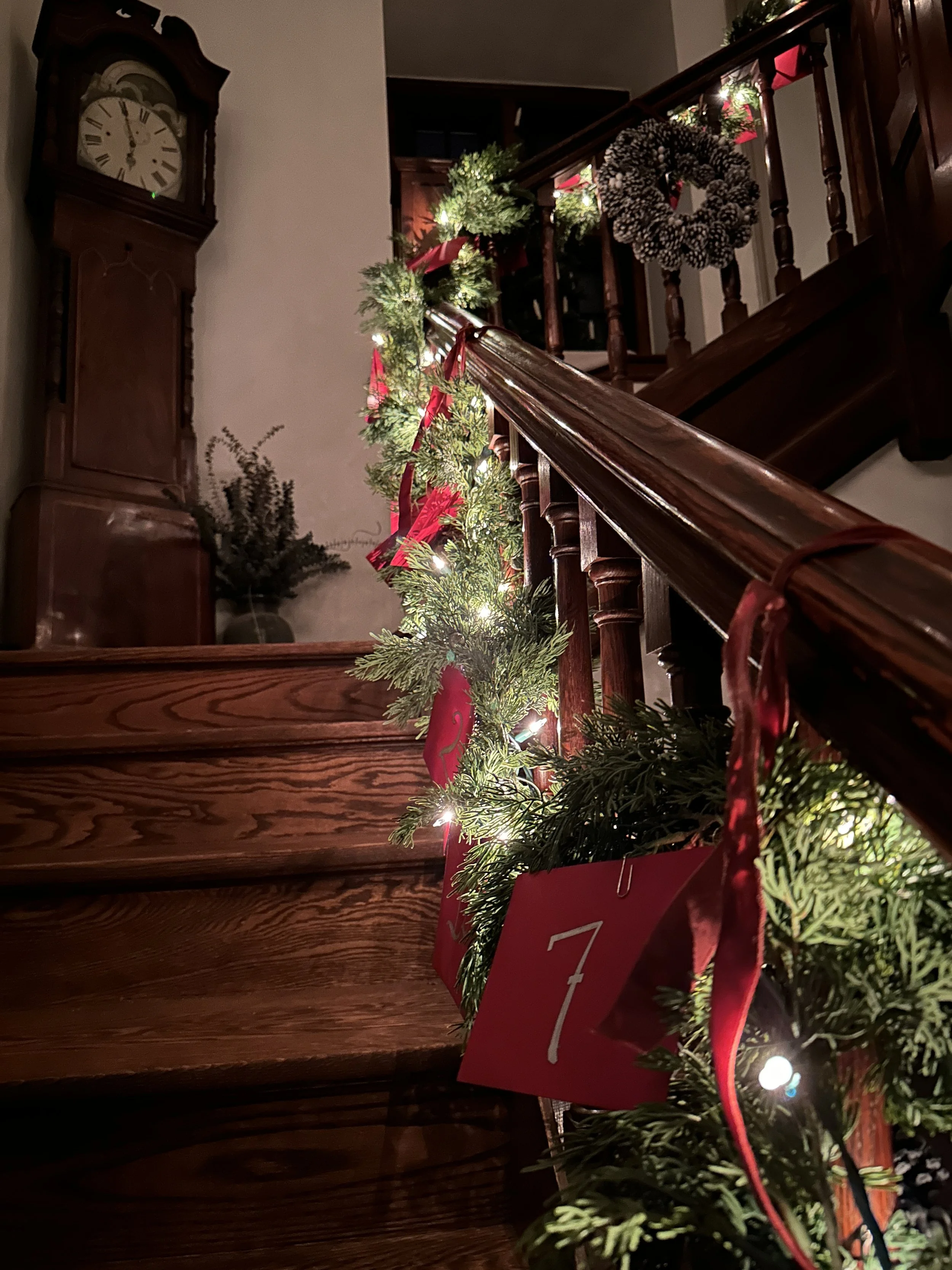 For the physical calendar, I knew from the moment we moved into our beautiful historic home that I would do two things: 1) cover the stairs in candles for shear fun and 2) use the stairs as a form of advent calendar for the kids because the pictures would be moments in themselves and it would be so fun to hunt for the number in a physical space versus just on a wall hanging or little doors. This little reel shows a quick version of what I do which entails….
