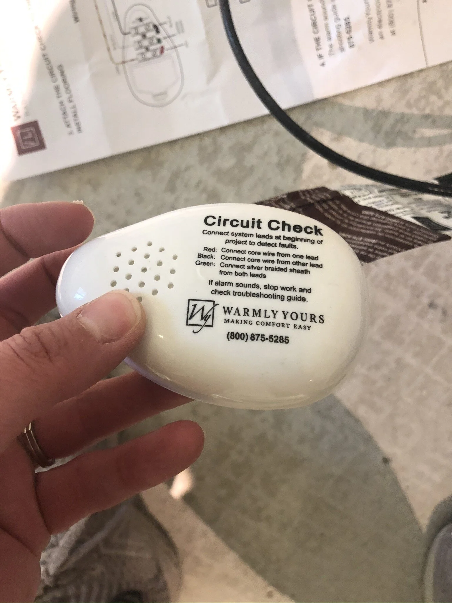 We inspected and checked our mats were the right specifications: with a 60’ long mat, we had fun laying it out from one end of the dining room, through the hallway, all the way down into the 25’ parlour to check that the length was correct! HA! The second mat at just over 5’ was much easier to measure. We inspected the wiring on the mats to ensure nothing was torn, broken, or looking damaged (even though they are quite resilient, you want to be delicate handling the wiring). Then we took the Ohm reading from each mat (we used this multi-meter), and compared it to the Ohm rating on the heating mat label. Each mat needed to be within a 10% variance of the reading before we proceeded, and we were well within the limit. This was our first time using a multi-meter, it’s very straightforward!