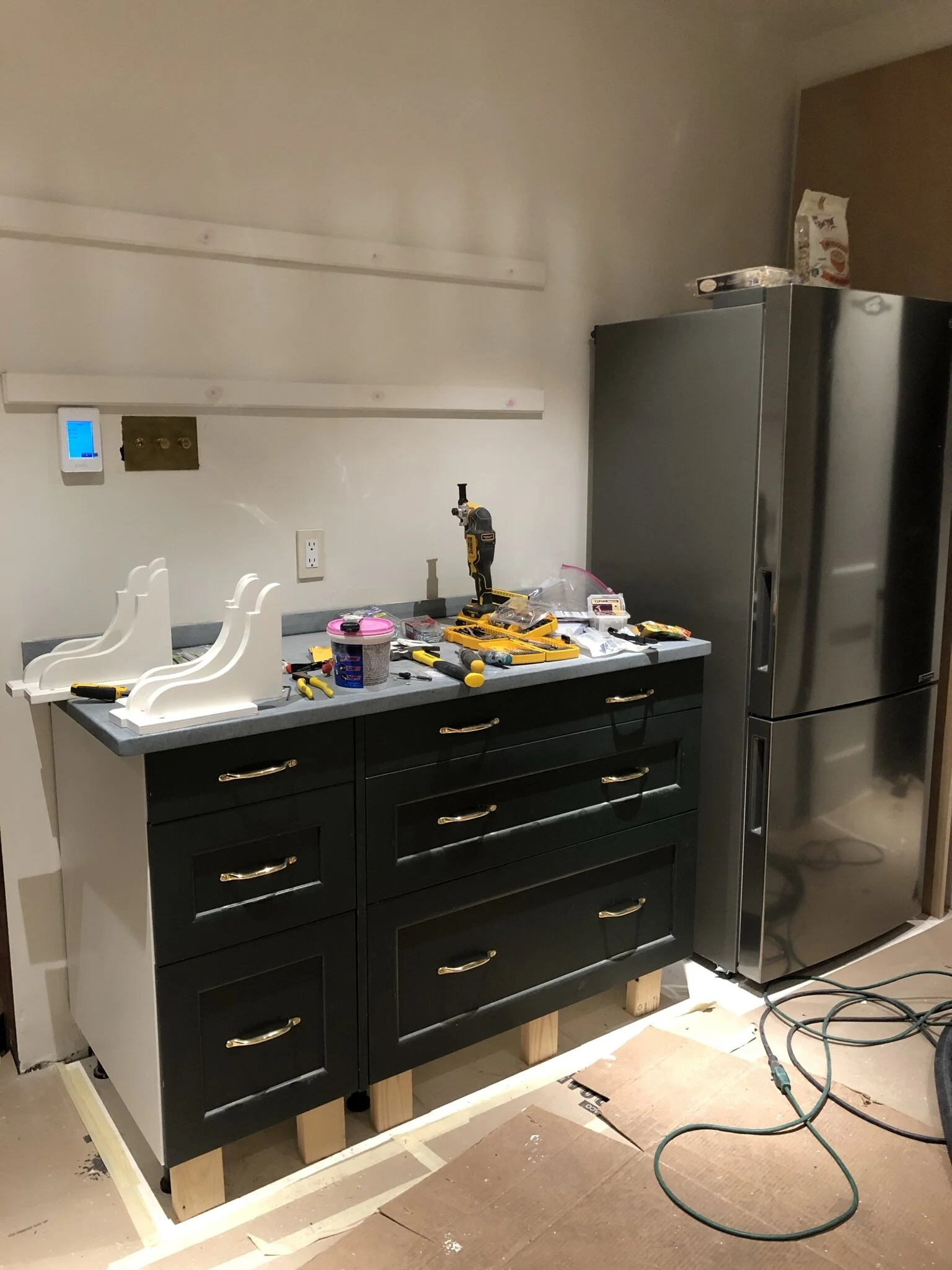 The third part was what actually took us the longest. We measured and marked everything before we cut any materials, just to ensure we had a rock-solid plan and that we’d thought through all the pesky details. This wasn’t wholly necessary, but my view was that taking this time upfront would mean the actual cutting of materials and laying out of the mats would go much faster if we weren’t measuring every single step 2-3 times. So, first of all, we marked with painter’s tape where our cabinets were going to go. Then we marked with sharpie where we were going to place our Hardie-backer border, which would sit proud of the cabinets by a couple of inches and contain the self-levelling cement in the final step. And then finally we drew the entire WarmlyYours heating mat layout on the floor, inch by inch. Once that was complete, I think it was about 3pm! We made a mental note that if we did this again, we would have called it a day here.